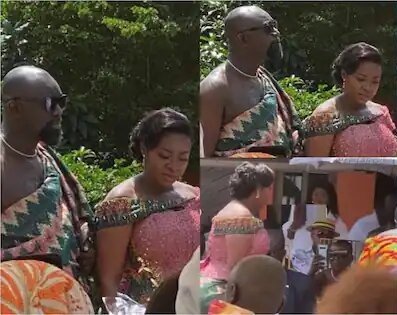 The couple donned green and peach kente outfits.